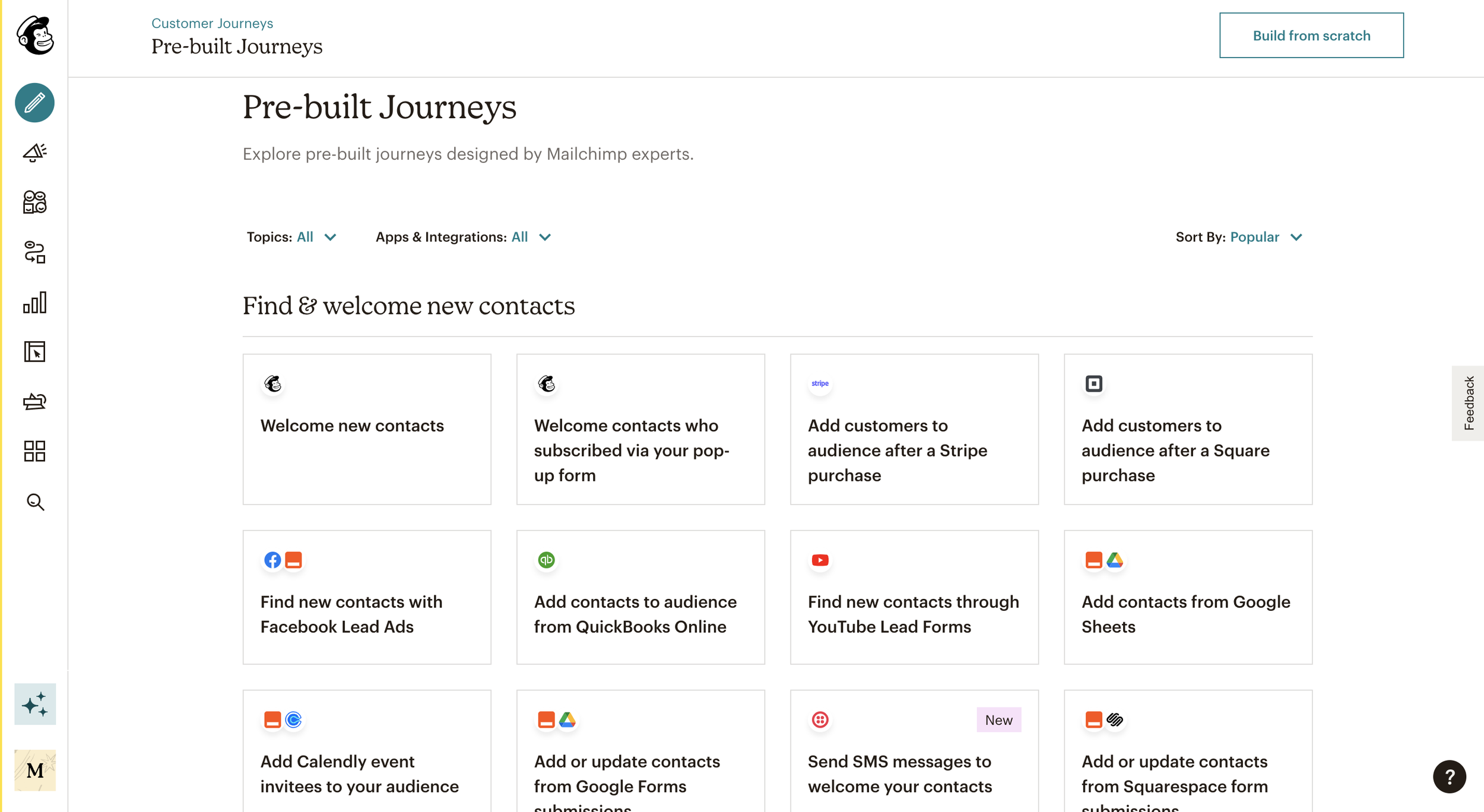 Mailchimp’s Pre‑Built Journeys were designed to help users launch automations faster, but the library was limited (around 10 journeys) and under-utilized. The templates didn’t reflect the full power of the automations builder (called Customer Journey Builder) or the growing list of integrations Mailchimp supported.