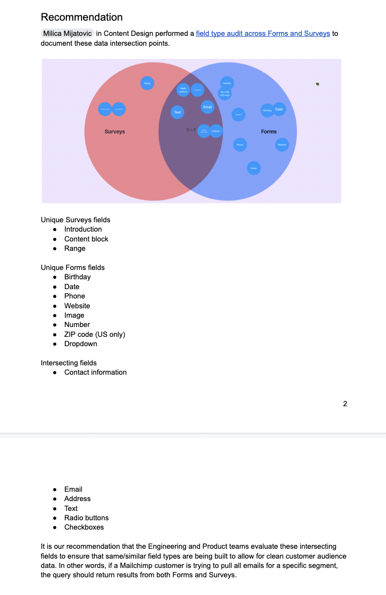 This was more than just “cleanup”. It was about surface-level content revealing deeper product architecture issues. By surfacing those risks through the content audit, I elevated the conversation from “these buttons are inconsistent” to “our products are diverging in data assumptions.” Ultimately, this kind of thinking helps Mailchimp deliver more reliable, trustworthy, and scalable experiences, all while eliminating user frustration.