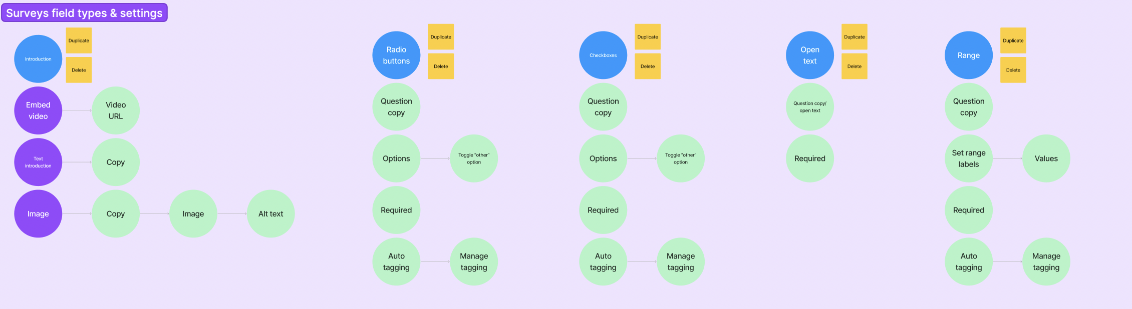 I audited every field type in both Surveys and Forms and noted how each behaved on the frontend and how that impacted the backend, aka where and how the data was being stored.